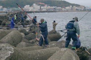 波は穏やかでもなく高くもなく。 今日の帽子岩はオレを抜かして爆発した! たぶん釣れてないのはオレだけ・・・。 いたるところで竿は曲がり、タモが動く。 小1時間で6,7本釣った人も。