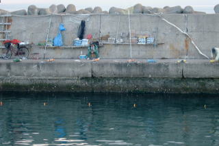 赤灯台のほうから日が差してきた。 久しぶりの海という気がする。 鱒浦のテトラは侮れない。 結構切り立っているのだ。 ベテランたちのマスのフカセ釣り。 今日は7,8人ほどか。 何度かマスが通ったらしい。