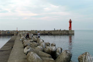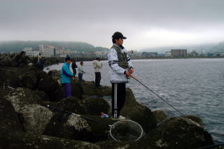 今日の帽子岩は釣れている!? 全体2,30人で5,6本はいい調子。 しかし我らにはキュウリウオのみ・・・。 定置網にはけっこう入っているみたい。 時間かかっていたよ。 夕方は鱒浦漁港へ。 4人ぐらいしかいないし、マスもいなかった。 夕暮れが漁港を包む。 今日一日またもや釣れなかった・・・。