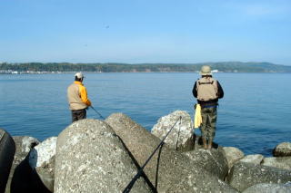 朝から不調で、昨日までのお祭りがウソのよう。 9時を過ぎると海側は人が少なくなった。 しかし天気が良くて波も穏やか、のんびりムード満点。 リンさんの背中が少々寂しいけれど・・・。 キッシー、幸運の4本ゲット(1本リリース)。 左の銀ピカメスがうれしい。 sinさんの90cmデカオス。 たばこの箱でも置けば良かったなあ。