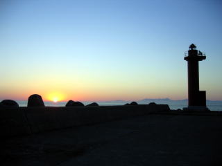 南防波堤の最先端、赤灯台に登る太陽。