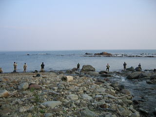30人以上は来ていたフンベだが、 マスは全く集まろうとはしていないようだ。 昨日とはうって変わったフンベ・・・。 朝はこの1本だけしか上がらなかった。 羨望のまなざしでみんなから見られたり触られたりしてた。 とっちさんの背中が寂しい・・・。 私ととっちさんは今日までの反省と これからの改善について話し合いながら、 マスのいない海に向かってやる気のないキャストを繰り返した。