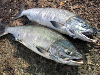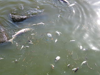 ウグイ、カワガレイ、サケやらが川側で浮かんでます。
