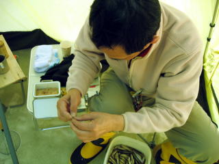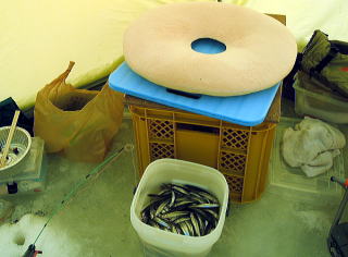 たまに雪がちらつくが、 概ねいい天気で暖かいくらいだ。 朝方は入れ食いモード全開で、 昼近くなると釣れなくなってしまった。 エサ付けにまだ慣れないとっちさん。 がんばれ!