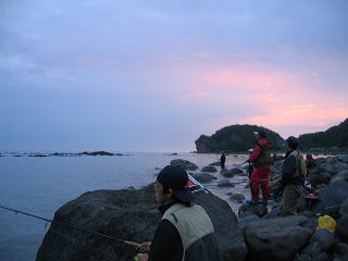 今日は15,6人か。そんなに多くではないがみんな気合い入っている。 この時期からやっているんだから、ということか。 しかし全体では7,8本かな。 5時過ぎに大きな群れが入って瞬間的に2,3本あがったが、それで終了。 今日のフンベで一番多くマスの口に仕掛けを食わせたとっちさん。 しかしその結末はバラシの連続だった。 フンベの新ハシゴを登りながら、次回でのリベンジを夢見る。 それが不敵な笑いとなった。