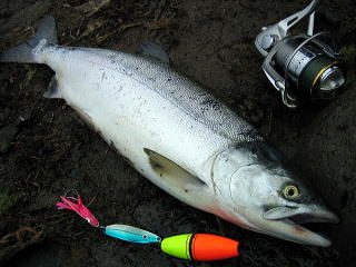 釣り人の多さに圧倒されるが、マスは全体10本程度。 雨も降り出して疲労のたまる釣りになった。 ウキルアーで釣れないので寝浮きにチェンジ、すると作戦成功。 Yさん、ベテランの技が光る。 最後の1投と思って投げたウキルアーに食らいついてきた! 信じられない、幸運に恵まれた2本目ゲット。