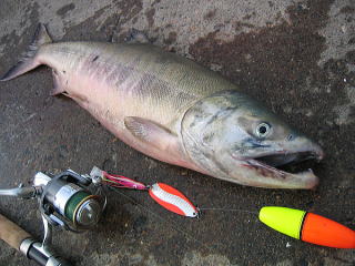 朝はゆっくりとスタート。 朝焼け空が私たちを迎えてくれた。 近くでマスが上がってからアキアジがポツポツ釣れ始めた。 やっとこさ、今年初のアキアジをゲット。 今日は釣れないかもしれないという不安を 見事消し飛ばしてくれたオスのアキアジだった。 9日は結構良かったという埠頭だが、 今日はポツポツとマス混じりでアキアジが釣れていた。 もう少し釣れてほしいなあという感じだった。