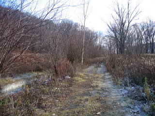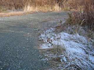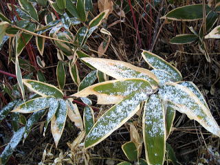 留辺蘂町近郊は、大雪山に近いということもあり、 海沿いの網走と比べると冬景色となっていた。 昨晩の粉雪が道路脇に積もっている。 もちろん砂利道も固く凍っている。 ササ(クマイザサ)の葉にはふわふわの雪がのっていた。 冬がゆっくりと山の麓に降りてきているのである。