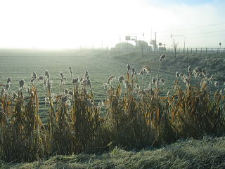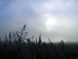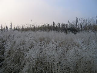 北見に向かう国道を行く。常呂川沿いに川霧が・・・。 自然現象とはいえ不気味だ。 その川霧の中に突入すると太陽が見えなくなる。 そこはまさに別世界だ。 その川霧の水分が霜となって地表を覆い尽くす。 真っ白な世界となっている。 その川霧を吸い込んで大きな霜を蓄えたススキの穂。 重くなってたっぷりと頭を垂れている。