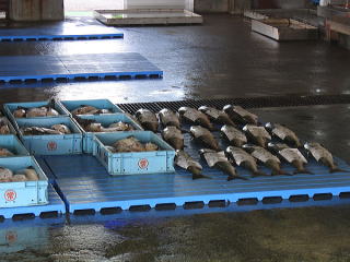 濁りはずいぶん取れて、マスがいないのがよくわかる。 いいのか、悪いのか・・・。 本当に慣れないこのテトラ。 薄暗い時間に来たのでさらに怖かった。 無事にこのハシゴも降りた。 漁港の反対側には比較的釣りやすい場所もある。 そっちのほうが釣りやすいだろう。 漁協内にマスが並べられていた。 マスは2,300本くらいか。 その横に一際大きな魚が・・・サケだ! サケは16本、釣りたいなあ。