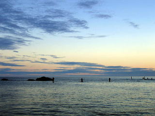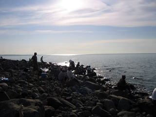 沖の岩礁に渡った人たちがこちら側へ立ち込んで、