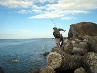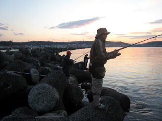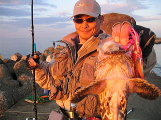 とっても釣れていない状況下で Eさんは2本釣り上げた。 まさに粘りの釣りだなあ、尊敬します。 あっという間に夕焼け。 昼過ぎから来るとこんなものか・・・。 とっちさん、カジカを釣ってご満悦。 ちなみにこれはギスカジカ。 (網走ではマカジカという人が多い) 外道図鑑を参照してください。
