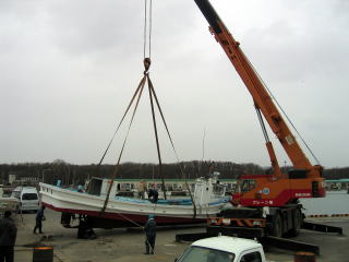 私たちのすぐ近くに置いてあった船が港に下ろされた。