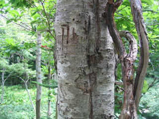 2湖の近くにはヒグマの爪痕で有名な木がある。