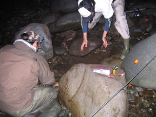 釣ったマスを入れるための穴を作成中のレガオさんとウメちゃん。