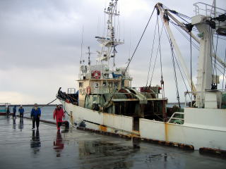沖が時化ていて戻ってきた底引き船。