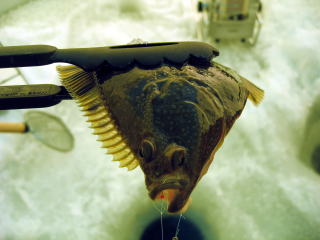 ワカサギの代わりにカワガレイ君が釣れます。