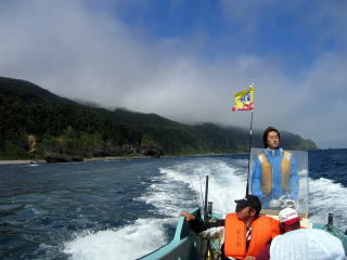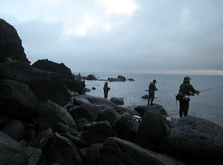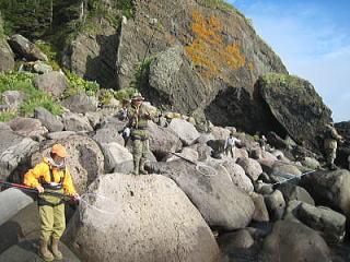 崩れた岩の隙間から滝が幾筋にもなって海へ。