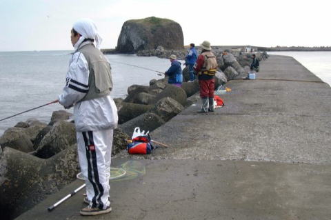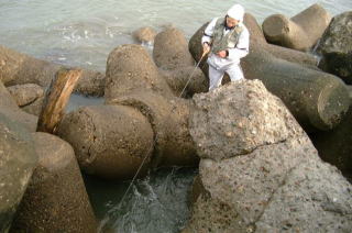 久しぶりの帽子岩。波が高くて防波堤をたまに乗り越えてきます。 テトラの上は怖くて行けません。