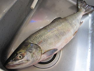 今年の前半戦は魚が少ない。 朝焼けはキレイだがアタリはないのである。 というわけでとても静かな一日になりそうな朝まずめ。 まあ、ゆっくりと時間を過ごす。 まずはイノケンさんが元気なアキアジをヒットさせる。 魚が入ってきたかな? 今度はEさんがカラフトマスをヒット。 なかなかいい暴れっぷりで、銀ピカだった。 次の日はまた別な場所での挑戦。 しかしノーヒットで終了、厳しい。 1日目でゲットした、記念すべき今年第1号のアキアジ。