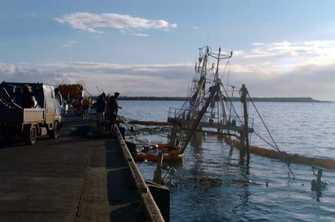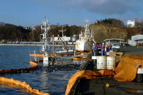 釣り人が浸水しているのを26日の4時過ぎに見つけて通報。 その後すぐに水没したらしい。船からは大量の重油が・・・。 これらの写真は、沈没の次の日の27日早朝です。朝早くからオイルシートで 一生懸命回収しています。被害が最小限にすめばいいのですが。 このオイルフェンスが使われているところを見たくなかった。 ここでの釣りは当分無理なのだろうか。
