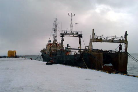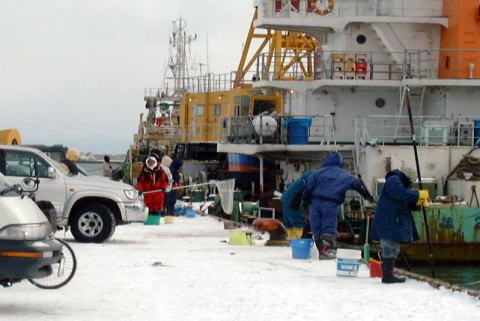 港はワカサギ釣りで一色、と思いきや、ワカサギすくいが大流行。 横の方で細々とチカ釣りしている人が針の数だけチカを釣っていた。 サルベージ船に引き上げられた、沈没した底引き船。 知っている人でないと沈没した船だとは分からないくらい普通。