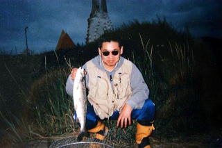 | 1997 初めてのカラフトマス 湖や川でのルアーフィッシングをこの年から楽しんではいたものの、それまで釣り上げたのはI湖でのアメマスだけであった。 魚はルアーフィッシングではマンガのようにそんなに釣れるものではない、そう思っていた7月の終わり頃、仕事を通じて知り合ったO君からこんな話を聞かされた。 これから秋にかけて、河口で、ルアーを使ってサケ・マスが釣れますよ。お盆の頃は特にマスは最高ですよ。 この話を聞いても簡単には信じられなかった。第一、サケマスをルアーの届くようなところで釣ってはいけない、河口での釣りは違反だ、と思いこんでいたからだ。 しかし、昨年は何本釣っただの、引きがすごいだのと聞いているうちに、話に引き込まれていった。そんなビッグフィッシュとの格闘は確かに魅力的である。 その一週間後、今度は道具を持ってきてもらった。ロッドは湖や川でのものよりは丈夫なものであった。まあ、それはおおよそ予想できた。しかし、魚を魅了しその口にかける「ルアー」を見せられたときにはびっくりさせられた。そのルアーにはタコベイトなるものがくっついていたのである。 このタコベイトがユラユラと漂うように動き、サケマスが食らいつくという説明を受けながら、どのようにこれを作ればいいのか、どんな材料がいいのか、を必至に考えていた。まだ海にもいっていないのに、まだサケマスを見てもいないのに、この釣りに、このルアーにはまってしまったのである。 それから2,3日のうちにロッドとルアーの材料を買いに走った。もう釣れると聞いていたお盆だったからだ。ロッドはそんなに高くないものを選んだ。ルアーはとにかく見せてもらったものと全く同じものを作ろうということで、数軒の釣具屋をまわった。とにかくやってみようという気持ちだけだった。 話を聞いていたM川河口に午後4時頃到着した。人が多いと聞いてはいたが、こんなにもなっているとは思いもしなかった。つい数日前まではだれもいなかったM川河口だが、すごい人だかりで、もともと狭い河口ではあるが入る隙間が全くないほどだった。 一人分の隙間をようやく見つけて、そこで例のルアーを投げてみた。確かにこのルアーのようにタコベイトをつけた人が多かった。 向こうの方では水しぶきを上げてマスが釣られているのが見えた。一呼吸おくたびにだれかが釣り上げているという状態であった。ロッドは弓なりに曲がり、マスの重量感・手応えが、釣れていないこちらにもひしひしと伝わってくる。 ふと水の中を見ると、黒いものがすうっと泳いでいくのが見えた。よく見ると、それはマスの群であった。統率のとれたきれいな群れ。 よし、これはオレにもつれるかもしれん。群れの鼻先にルアーをゆったりと流して・・・。 きた!! グッと竿先が水面の方へと曲がり、マスの重さが両腕に伝わってきた。そしてジャンプ! こんな引きは初めてだった。興奮しながらもそのマスをじりじりと引き寄せると結構大きめのオス。 狭い場所なのですぐに引き上げようと思ったが、ここで大事なことに気がついた。ラインは細いにもかかわらず、自分の足下はコンクリートの高い場所だったため、マスを引き上げることができないのだ。長い柄のランディングネットがないと無理なのだ。そうか、と気がついたときにはマスの口からルアーがはずれ、バレてしまった。針かかりも弱かったらしい。 二つのことを反省しながら、すこし場所を移動して再びチャレンジすることにした。ネットを持っている人の隣に行き、それを借りようという姑息な作戦だ。 30分ぐらいたったあと、また群れが私の近くにやってきた! 周りの人も戦闘態勢。ようし、こい・・・、 きた!! 再び私のルアーにマスが食らいついた。今度はしっかりとアワセを行い、きちんとハリをマスの口にかけてやった。ジャンプはするものの、さっきみたいにはずれやしない。よし、頭を下げてネットを借りよう、と思い隣を見ると、さっきまでいたおじさんが消えている・・・。 やばい・・・、と思ったその時、私に話をしてくれたり道具を見せてくれたO君が後ろに立っていて、ネットの準備をしながら大丈夫ですよと声をかけてくれたのだった。見事O君のネットの中にマスが収まったのであった。 初めて釣り上げたという興奮と、運良く現れてくれたO君への感謝の気持ちと、きちんと下調べもせずいきなり挑戦した自分の無謀さをあらためて実感しつつ、この釣りはもうやめられないと思ったのであった。 |